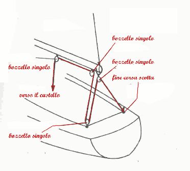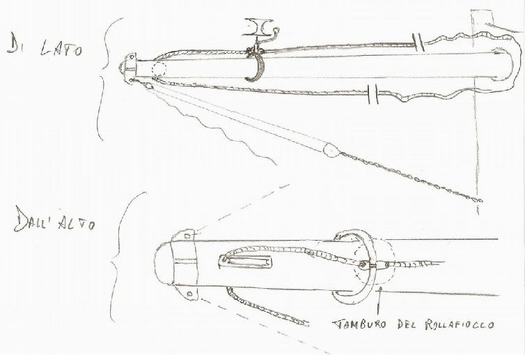 Il disegno qui sotto è di Giuseppe Casalino ed illustra l’anello di cui è dotato il bompresso di alcune barche. Sull’anello può essere montato un rollafioccco. Il sistema consente all’anello di scorrere sul boma per portare indietro o buttare fuori la vela.