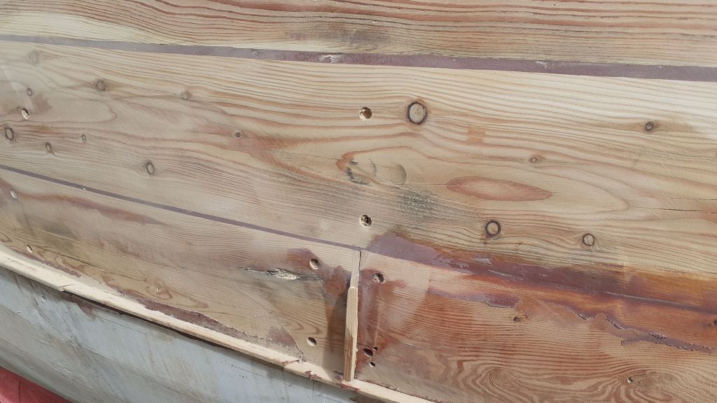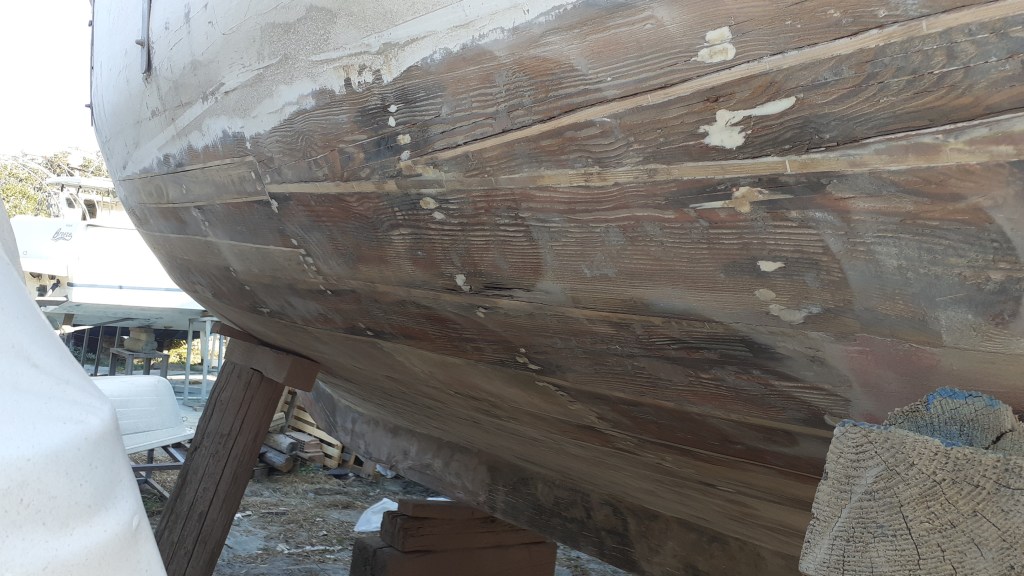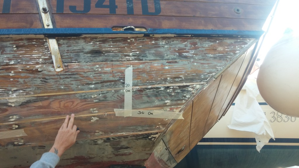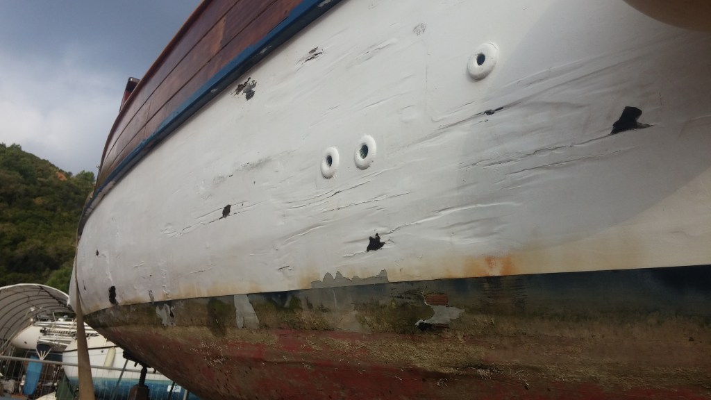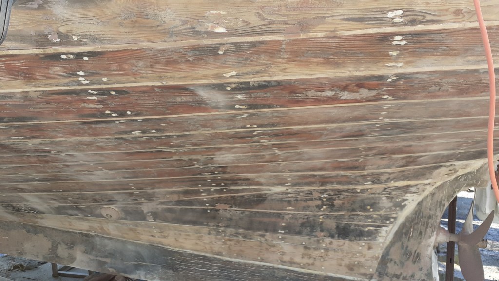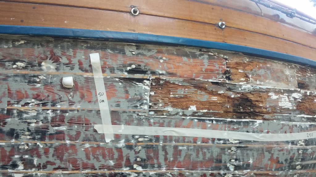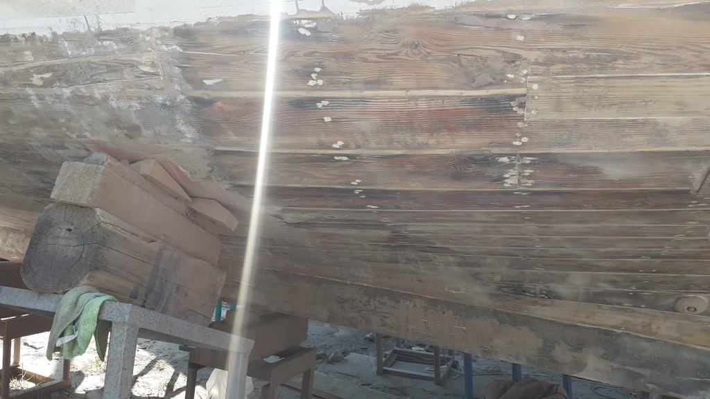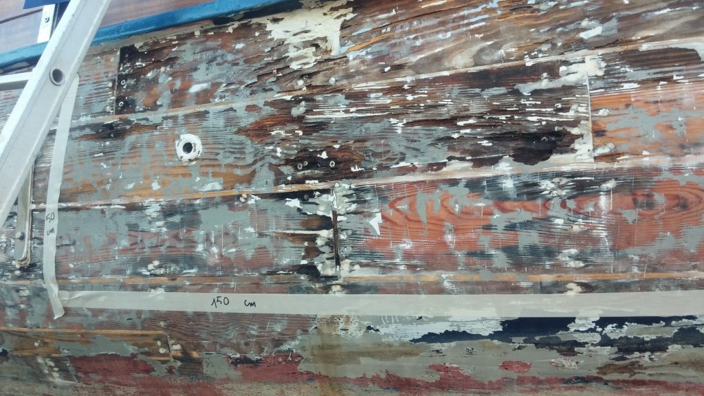 Riportare tutto a legno significa rimuovere tutte le mani di vernice, smalti, primer, stucchi e quant’altro, per poter toccare con mano le tavole del fasciame, verificarle una per una, valutare gli interventi fatti, decidere con calma le azioni da intraprendere…