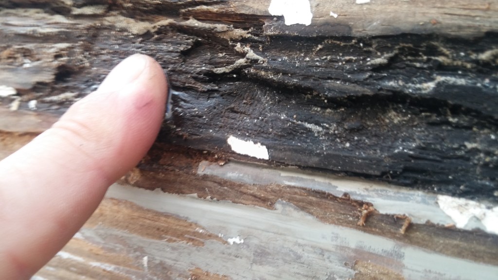 Scopriamo anche la causo del disastro: qualcuno, forse per risparmiare, ha sigillato col silicone bianco da idraulica, e, quindi,ricoperto completamente, il trincarino. Il silicone, oltre a non far traspirare il legno, ha causato l’accumulo ed il ristagno dell’acqua dolce, innescando così la marcescenza.