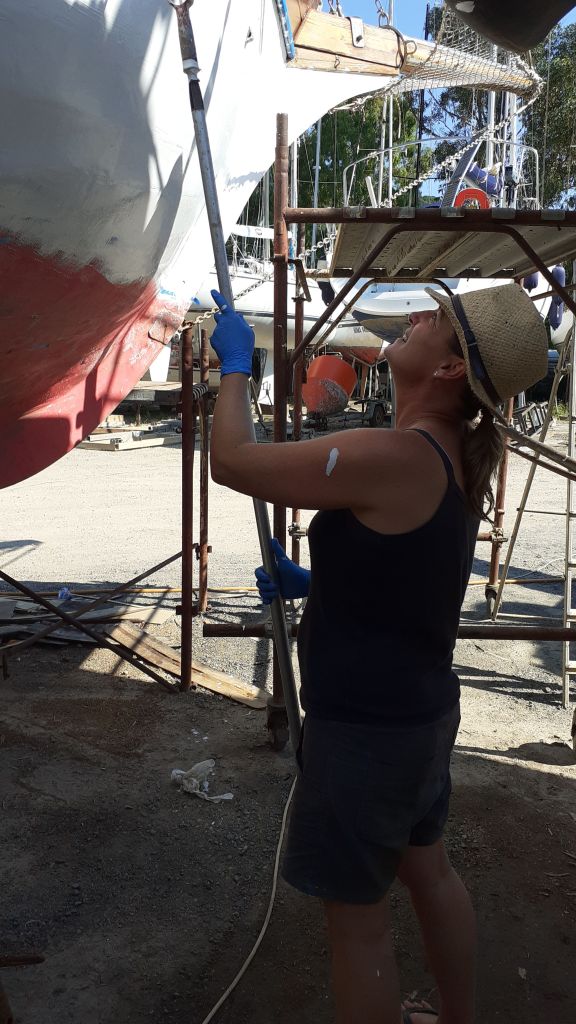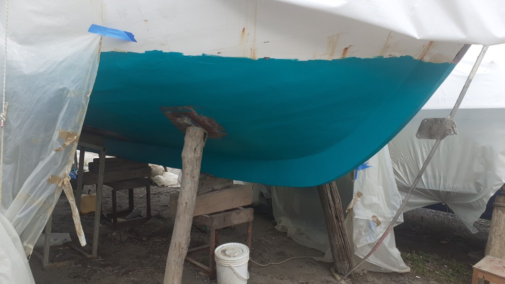 Ormai siamo lanciatissimi, vernice bianca sulle murate, 2 mani, antivegetativa 2 mani e finalmente..