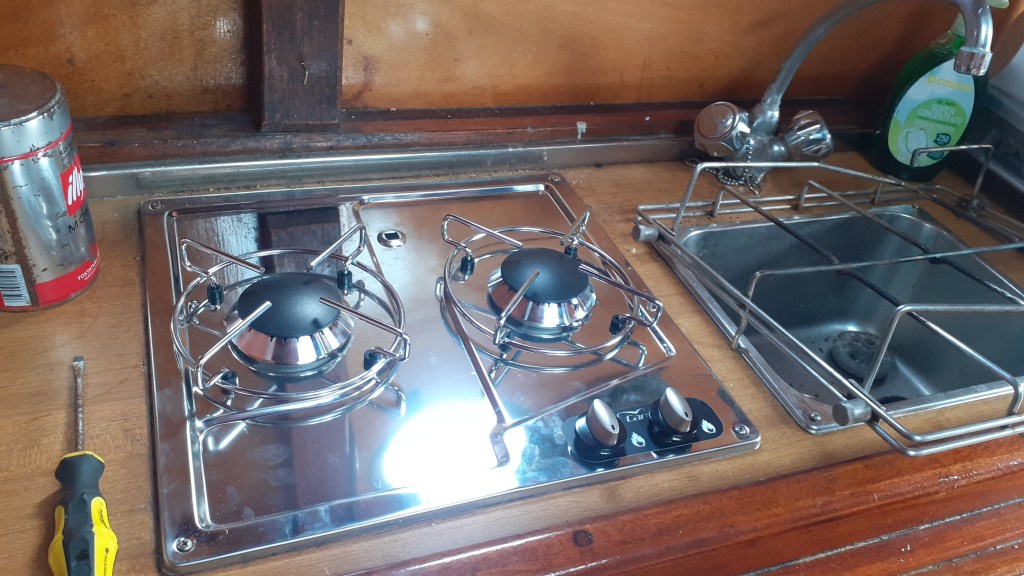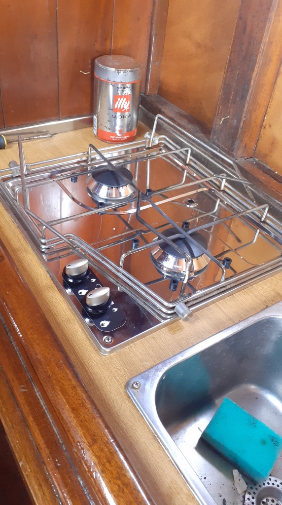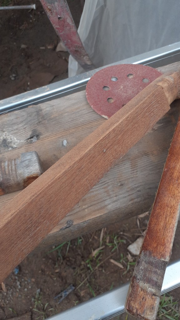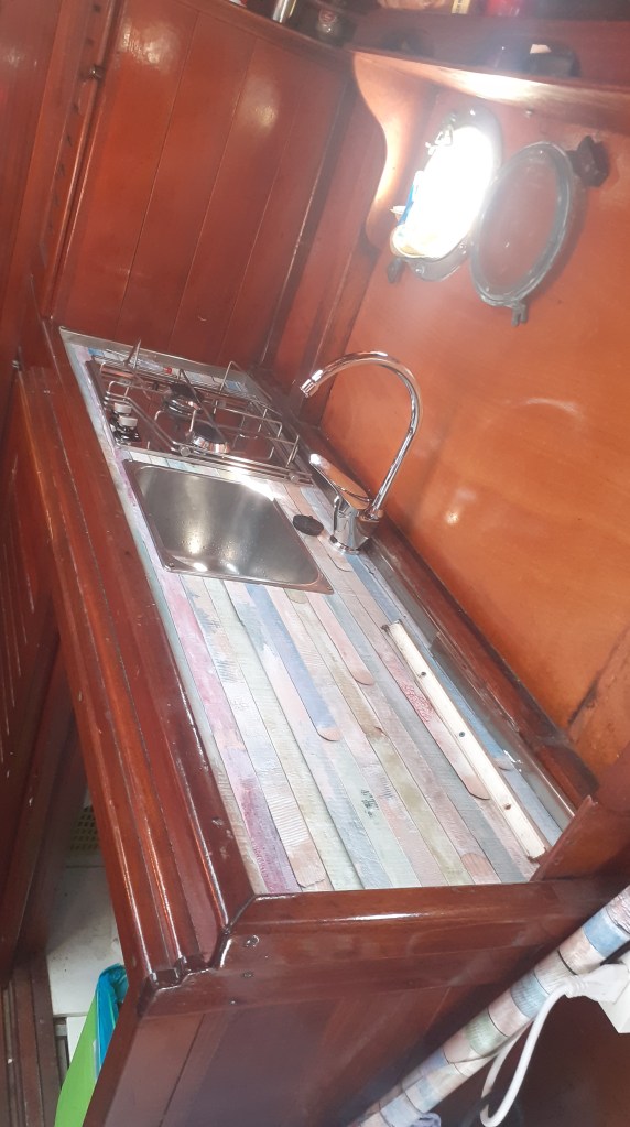 Intanto Claudia ha levigato tutte le parti con il legno a vista, e dato 3 mani di coppale sullo specchio di poppa, sulla falchetta, candelieri e quant’altro.